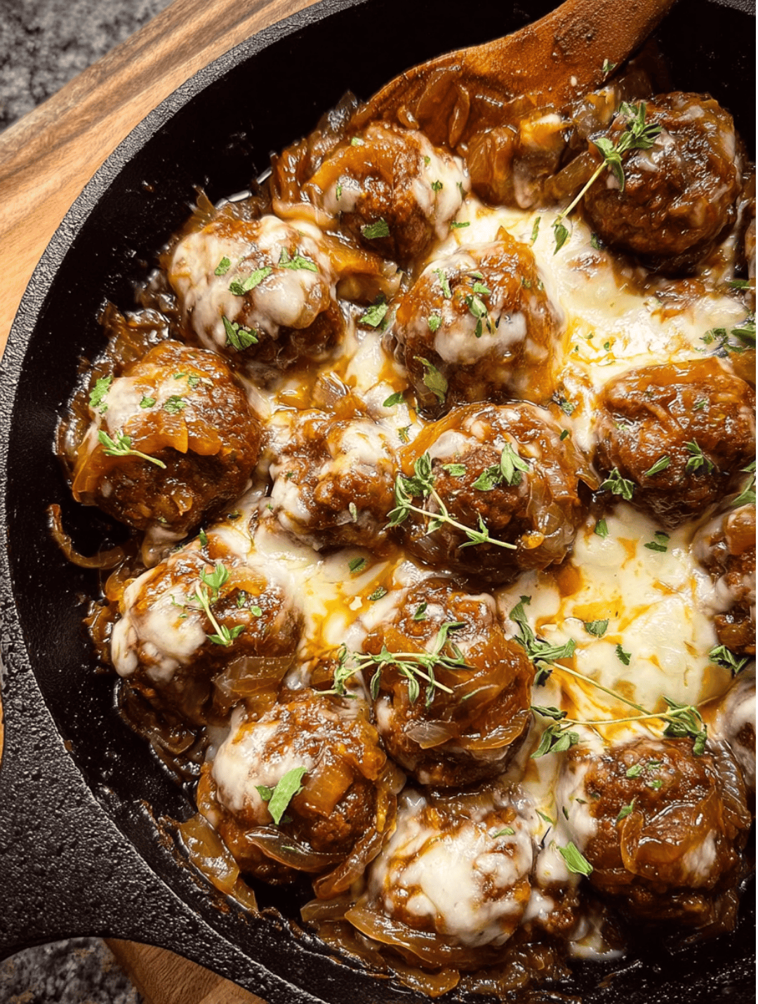 If you love the deep, cozy flavors of French onion soup, these Savory French Onion Meatballs are about to become your new favorite comfort food. Tender, juicy meatballs simmer in a rich caramelized onion gravy, then get finished with a blanket of gooey Gruyere and mozzarella that bubbles to golden perfection.