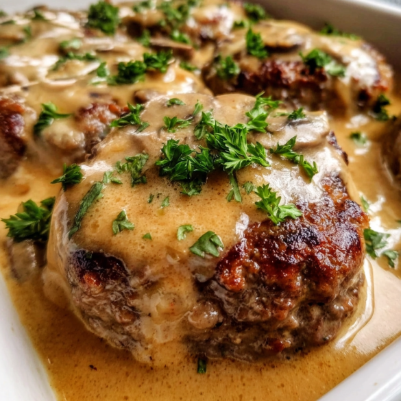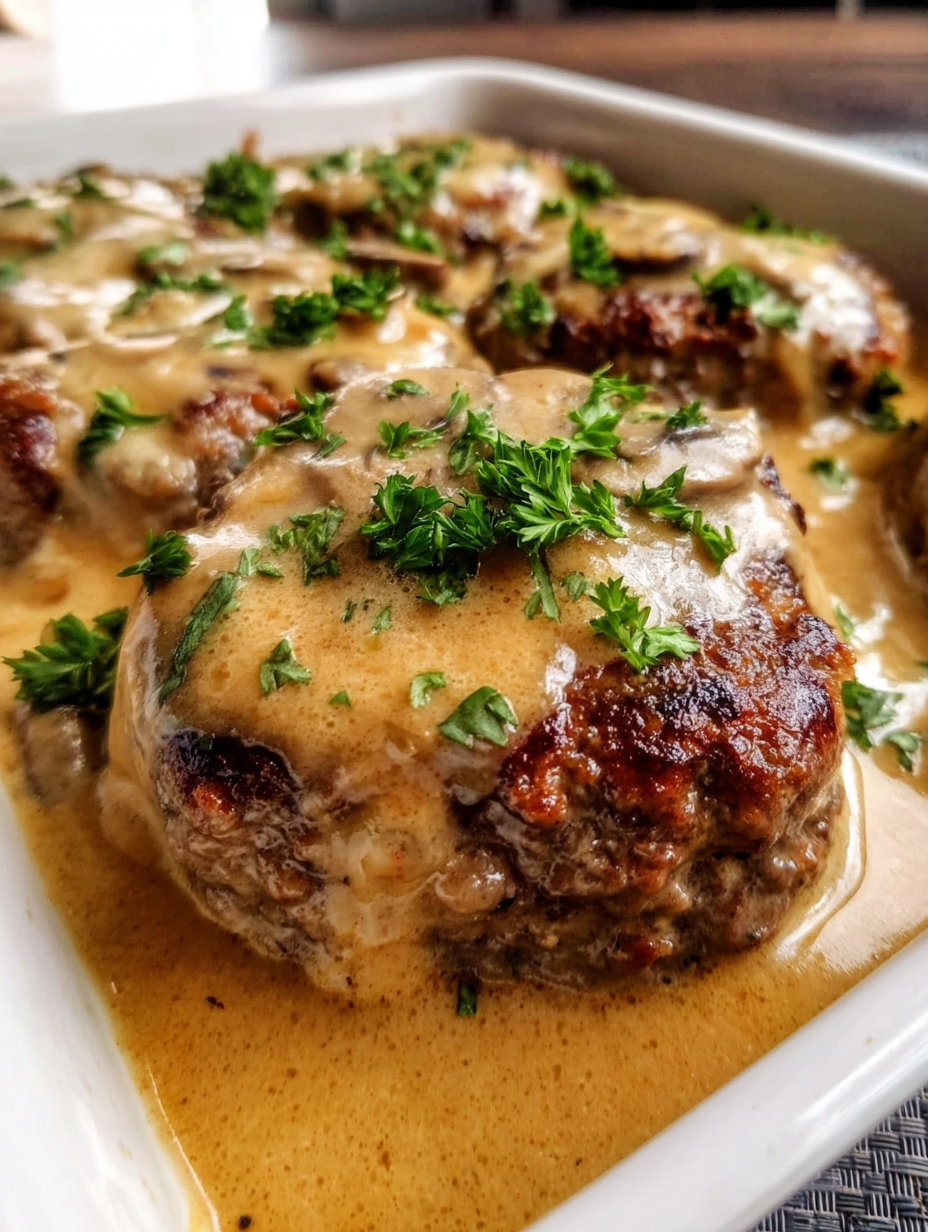 Arrange the browned patties in your greased baking dish. Pour the mushroom gravy evenly over the top. Cover the dish with foil and bake for 30 minutes. Remove the foil and bake for another 10 minutes, until the gravy is bubbling and thickened.