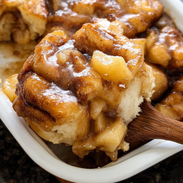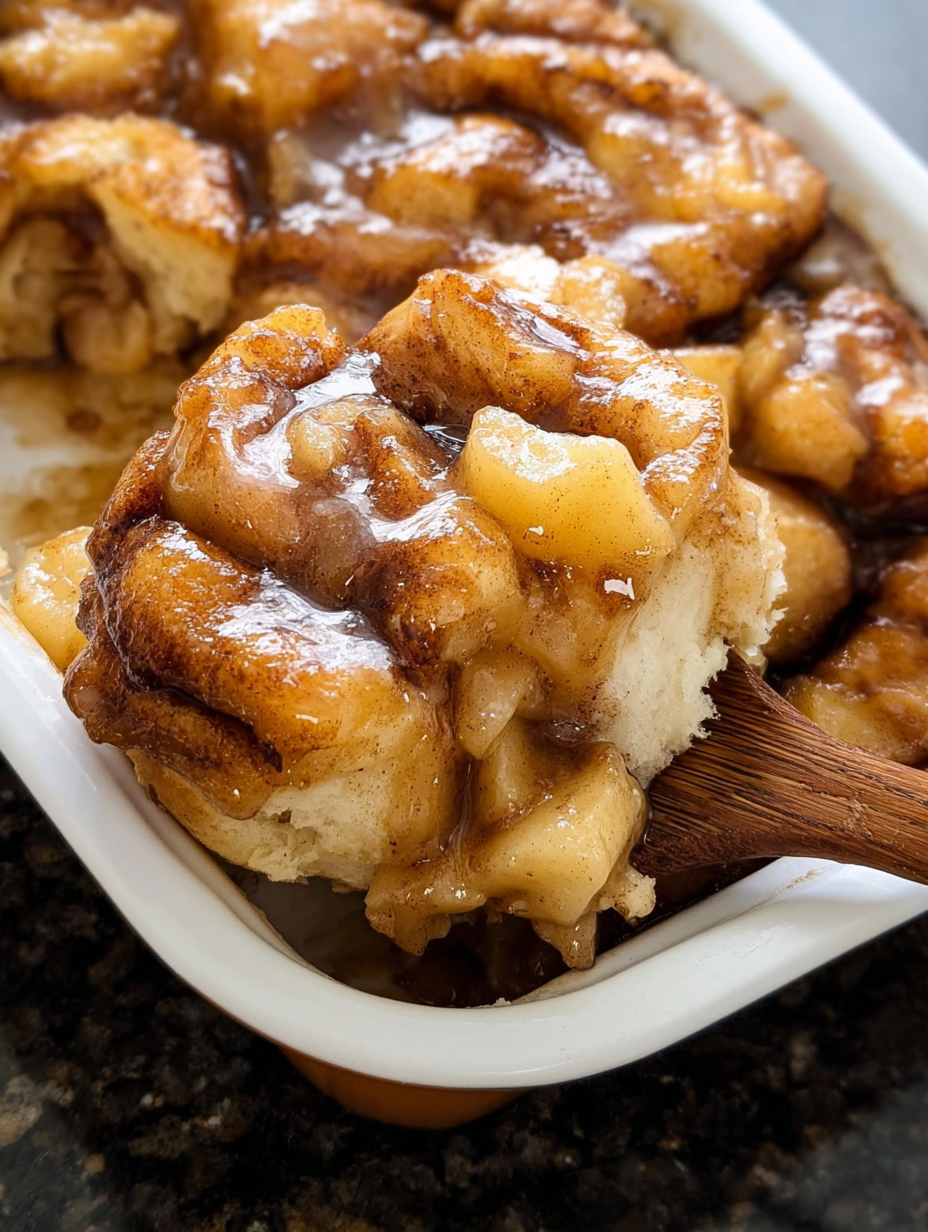 Drizzle the warm bake with the reserved frosting (and maybe a little caramel sauce if you’re feeling extra). Serve warm and enjoy that perfect mix of gooey cinnamon rolls and tender apples!