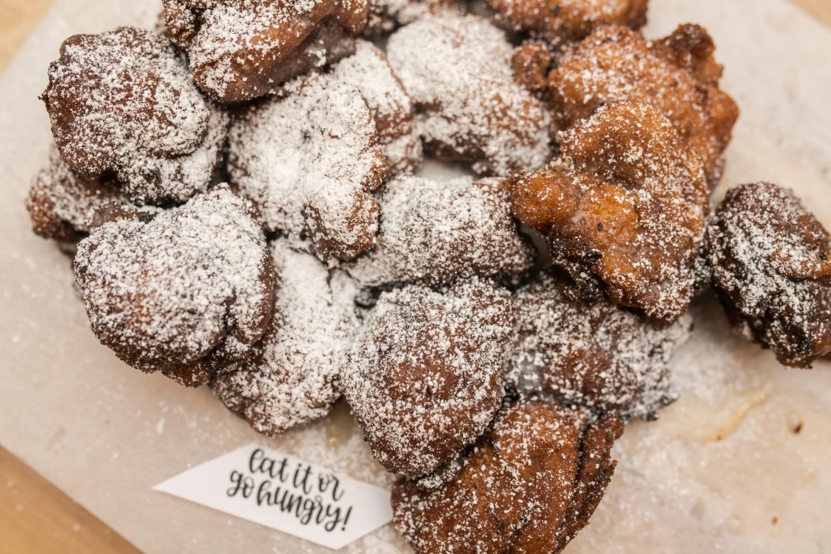 You probably want your fritters to be as airy as regular donut holes. You won’t reach that level of airy because of the density of the apples, but the fritters shouldn’t be too dense. When you’re folding in your apples, make sure not to overmix the dough. Fold them in just enough to cover them and give the dough lots of space to breathe.