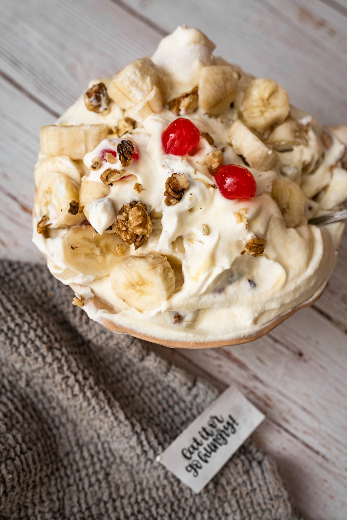 This salad is perfect for an easy homemade dessert. You can serve it to your kids or guests, or eat one on your own with a cup of hot tea. Keep in mind that it’s not a mobile dish and you shouldn’t keep it in the fridge for too long. Our banana split fluff salad is best enjoyed on the same day.