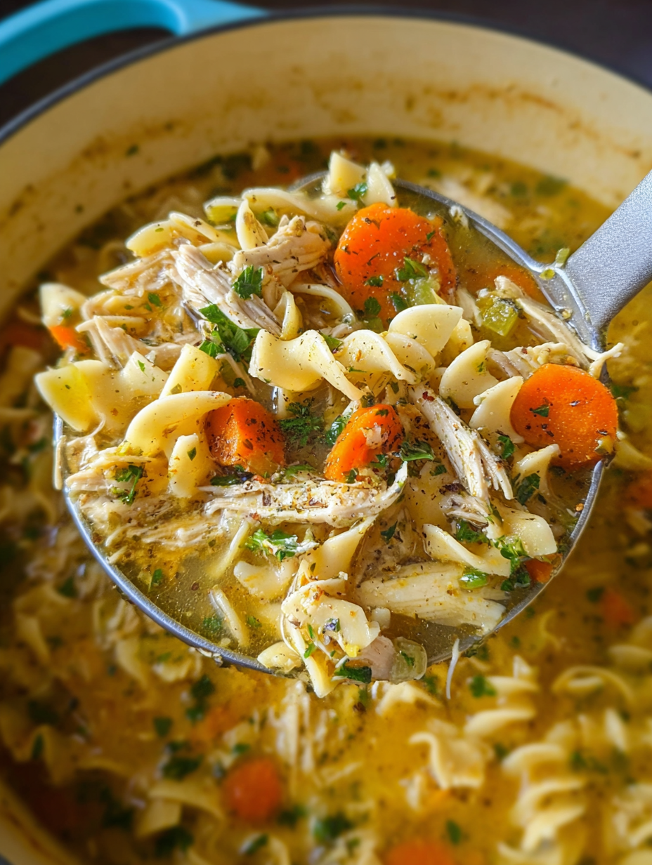 Classic egg noodles are my favorite because they stay tender and soak up the flavor of the broth. If you can’t find them, any short pasta like rotini or small shells will do — just keep an eye on the cook time so they don’t get mushy.