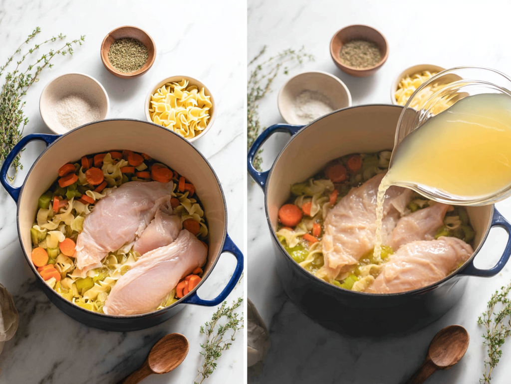 - Pour in the broth, then add the chicken breast(s), salt, pepper, oregano, thyme, and bay leaves. Bring the pot up to a gentle simmer over medium–low heat.