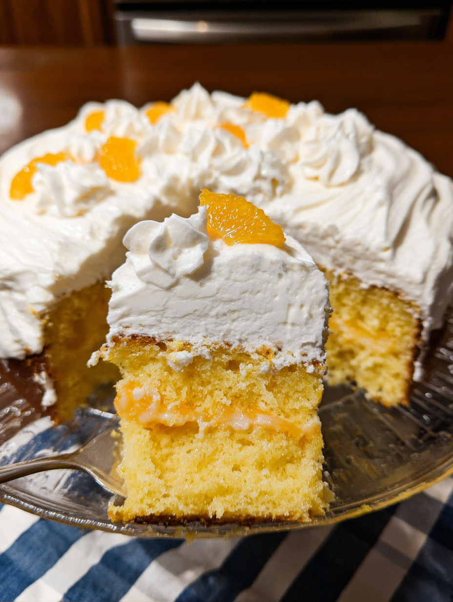Frost the cooled cake with the whipped topping mixture and top with the second can of drained mandarin oranges.