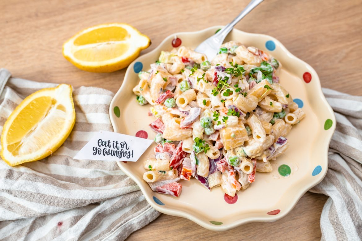 Mixing pasta with veggies is a great way to get your fiber in and still have a delicious meal. This easy macaroni salad will make a great lunch that you can take with you to work. It is also an excellent dish for BBQs. You can make the salad at home and take it to a friend’s house when they’re having people over. This creamy salad combines our favorite carb with delicious vegetables and herbs. On top of that, it is so easy to make! All you have to do is boil some pasta, chop up some veggies, and mix it all together.