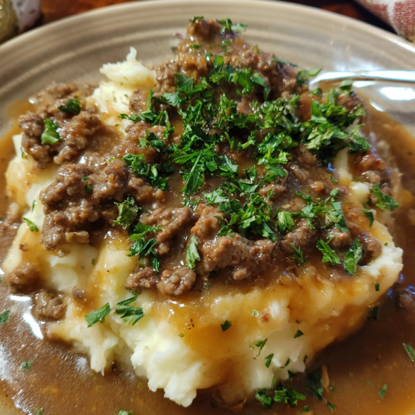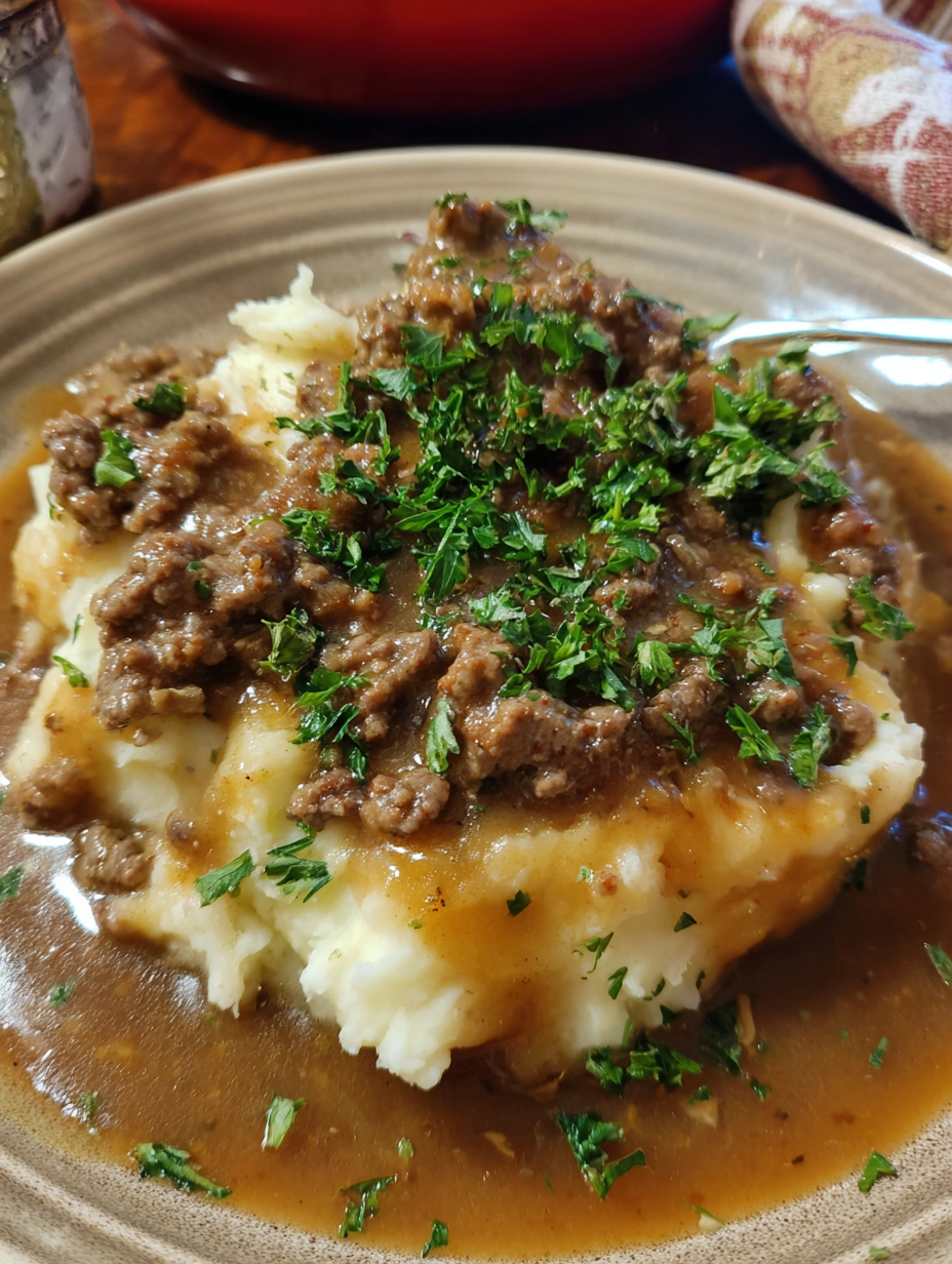 Spoon a generous bed of mashed potatoes onto each plate, spoon the ground-beef gravy over the top, and finish with chopped fresh parsley if you like. Serve hot with a simple green side or roasted vegetables.