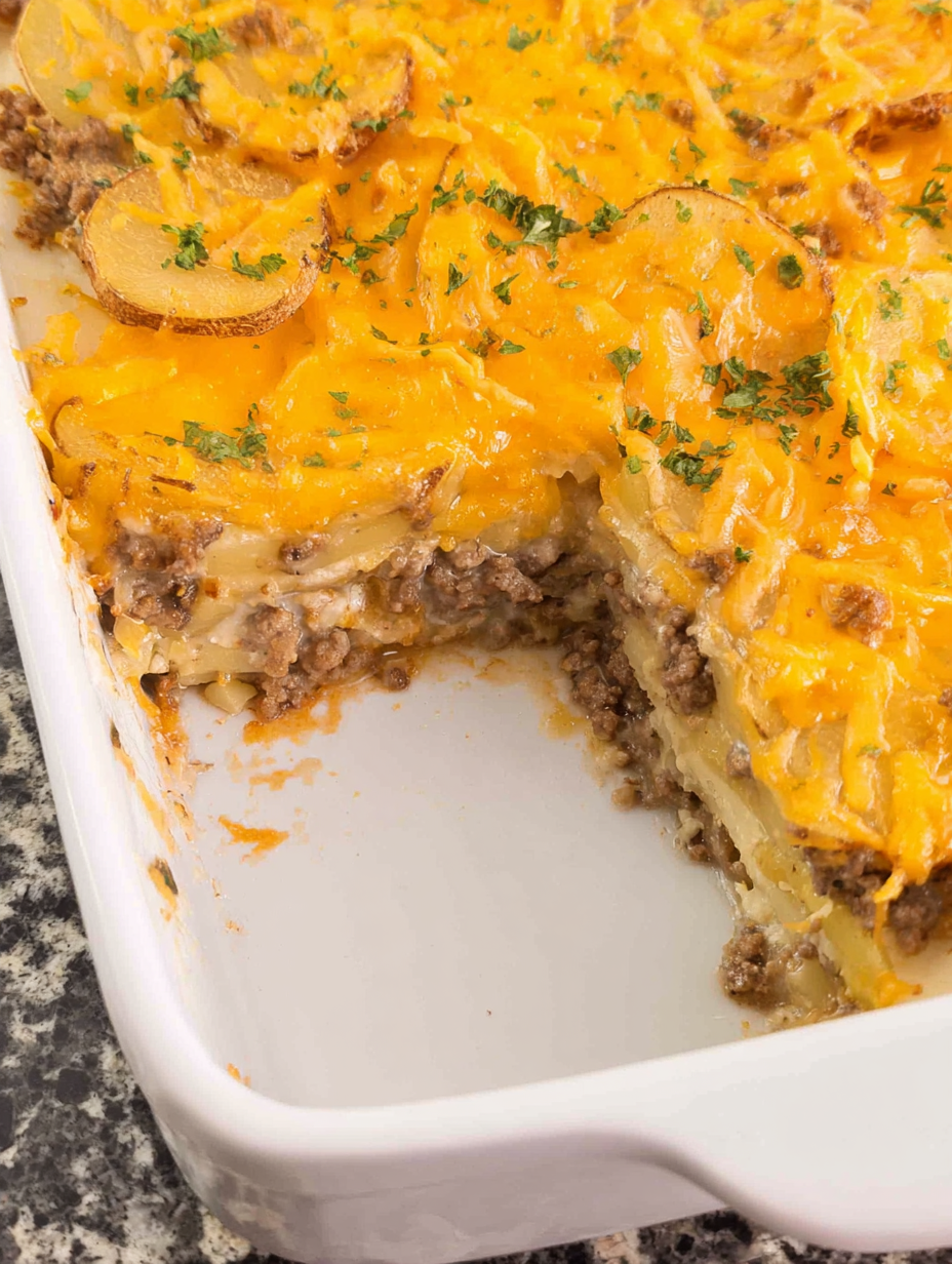 Finished with melted cheddar cheese and a crispy French fried onion topping, this ground beef and potato casserole is simple, satisfying, and perfect for busy weeknights, potlucks, or make-ahead family dinners. It’s old-fashioned comfort food done right.