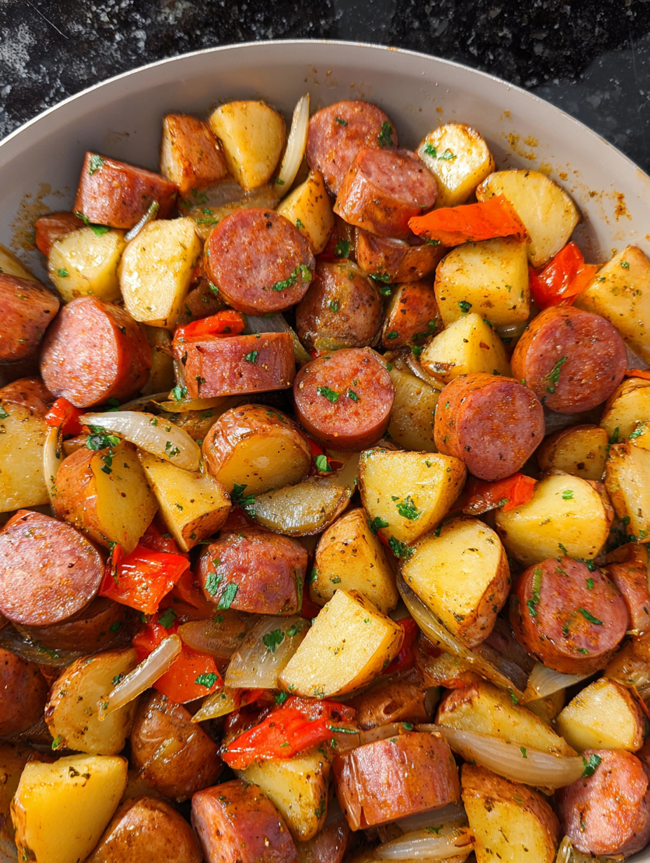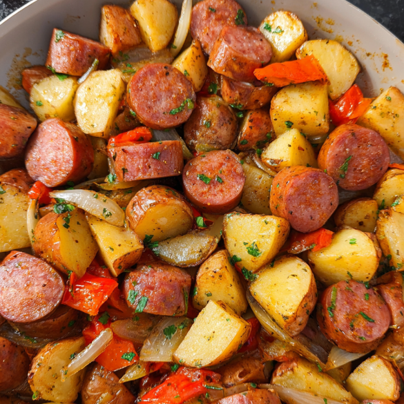 Return the browned sausage to the skillet and stir it into the potatoes and veggies. Lower the heat and let everything cook together for another few minutes, just long enough for the flavors to mingle and the potatoes to finish cooking through.