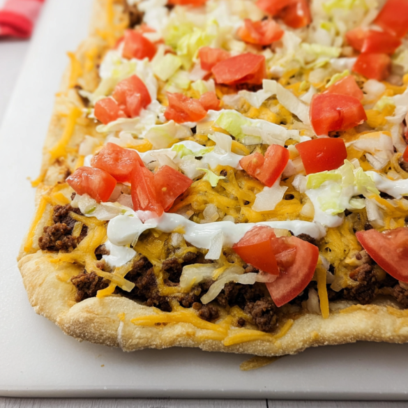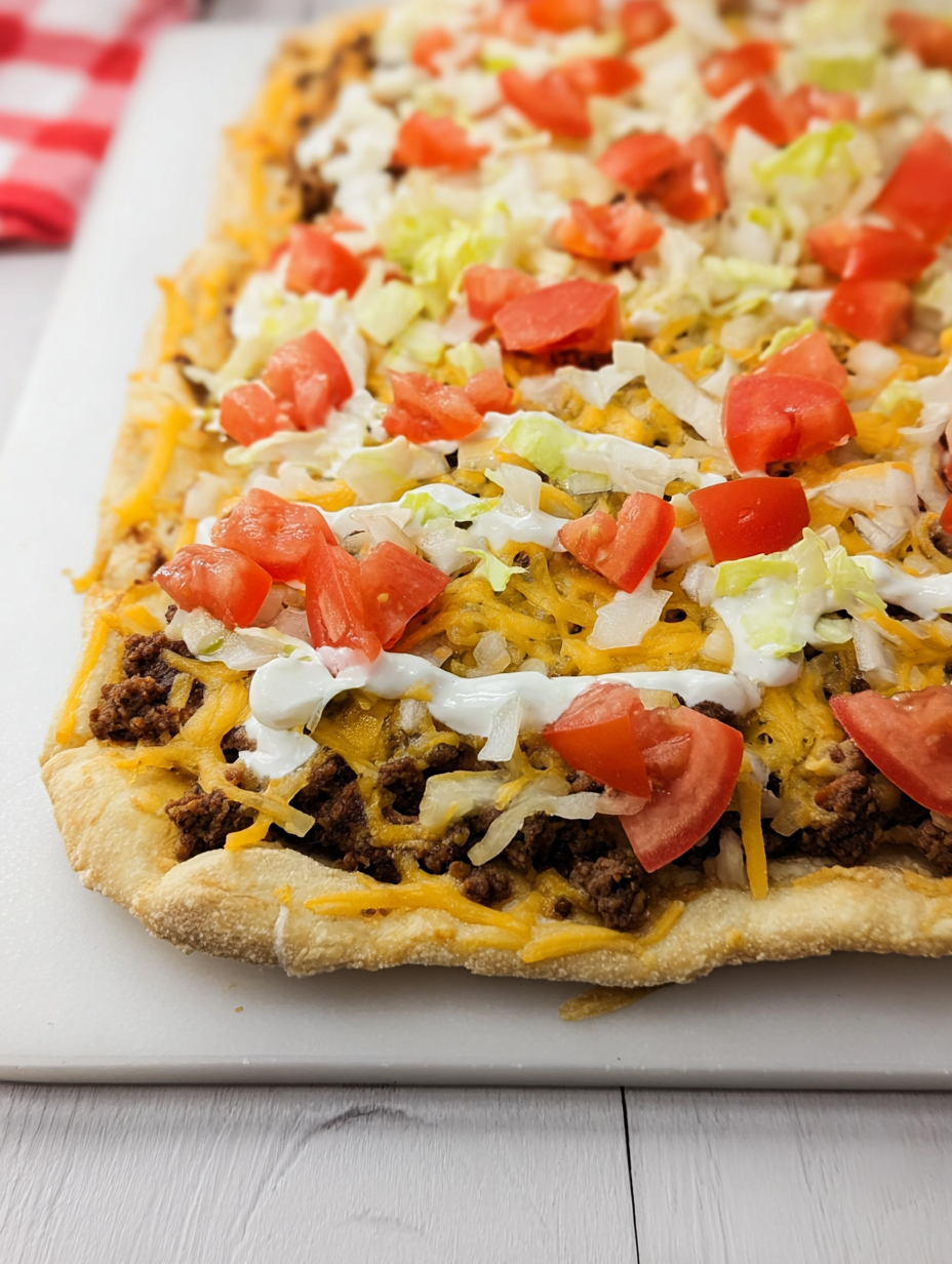 If you love tacos and you love pizza, this Taco Pizza is about to become your new obsession. It’s everything crave-worthy about a classic taco piled onto a warm, flaky crust — seasoned beef, creamy sauce, fresh lettuce, juicy tomatoes, and lots of melty cheese. It’s quick, fun, family-friendly, and always the first thing to disappear on game nights or casual dinners. The best part? It comes together in under 30 minutes, so dinner is done before you know it.