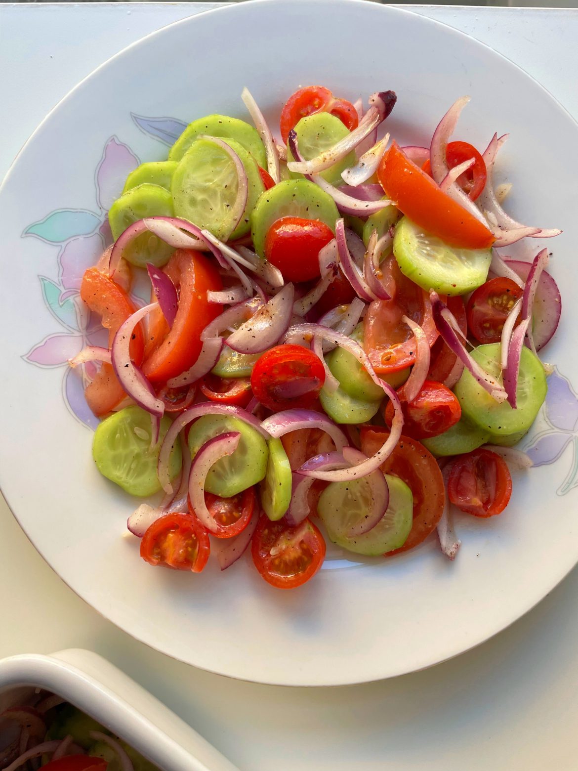 What we look for in a side salad is freshness. This is not a potato salad or a coleslaw, that goes so well with chicken wings and BBQ ribs. This tomato cucumber salad will be a great pairing for some grilled chicken with rice, and other healthy and light dishes.