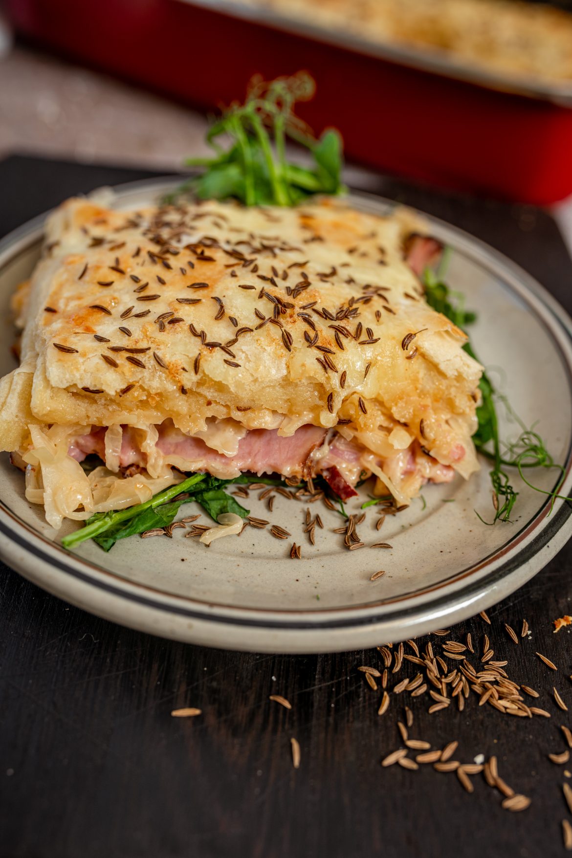 Add the resulting dough on top of the cheese, brush the top with some beaten egg white, add caraway seeds, and bake your pastry for 12-16 minutes.