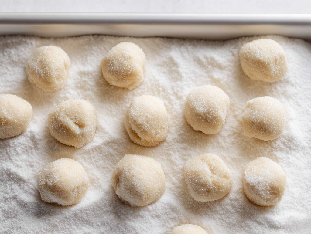 Scoop the dough into small portions, about 2 teaspoons each. Drop several dough balls at a time into the sugar and gently roll them until coated. Place them on the prepared baking sheets, leaving space between each cookie.