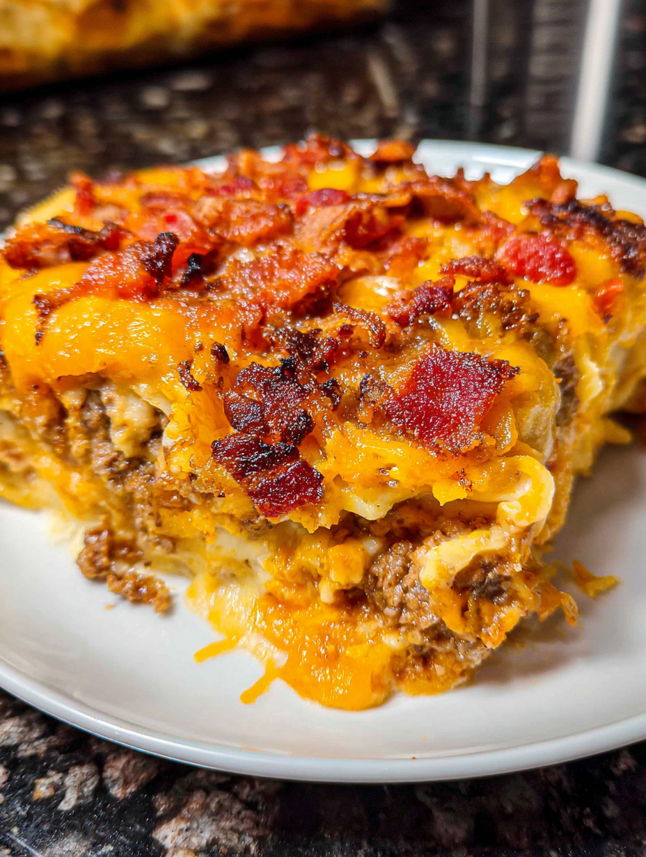 If you love cheeseburgers and lasagna (who doesn’t?), this sheet-pan mashup is everything good about both, but faster and easier to serve. Layers of cheesy soup, ricotta, hearty beef, and crispy bacon bake up on one sheet for an impressively cozy dinner with almost no fuss. It’s perfect for feeding a crowd, potlucks, or a family-style weeknight dinner where leftovers heat up beautifully.
