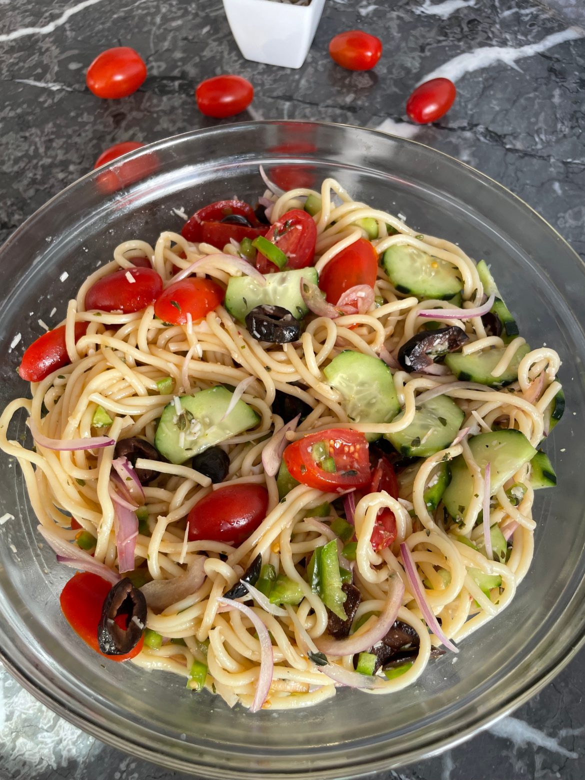 You’ve probably heard of pasta salad. Most people use smaller pasta shapes in their pasta salad. We say – why not go bigger? California spaghetti salad is the perfect pasta salad for a warm summer day. You don’t have to worry about it going bad in the sun because all the ingredients are picnic-friendly. Plus, it won’t take long to eat the whole bowl!
