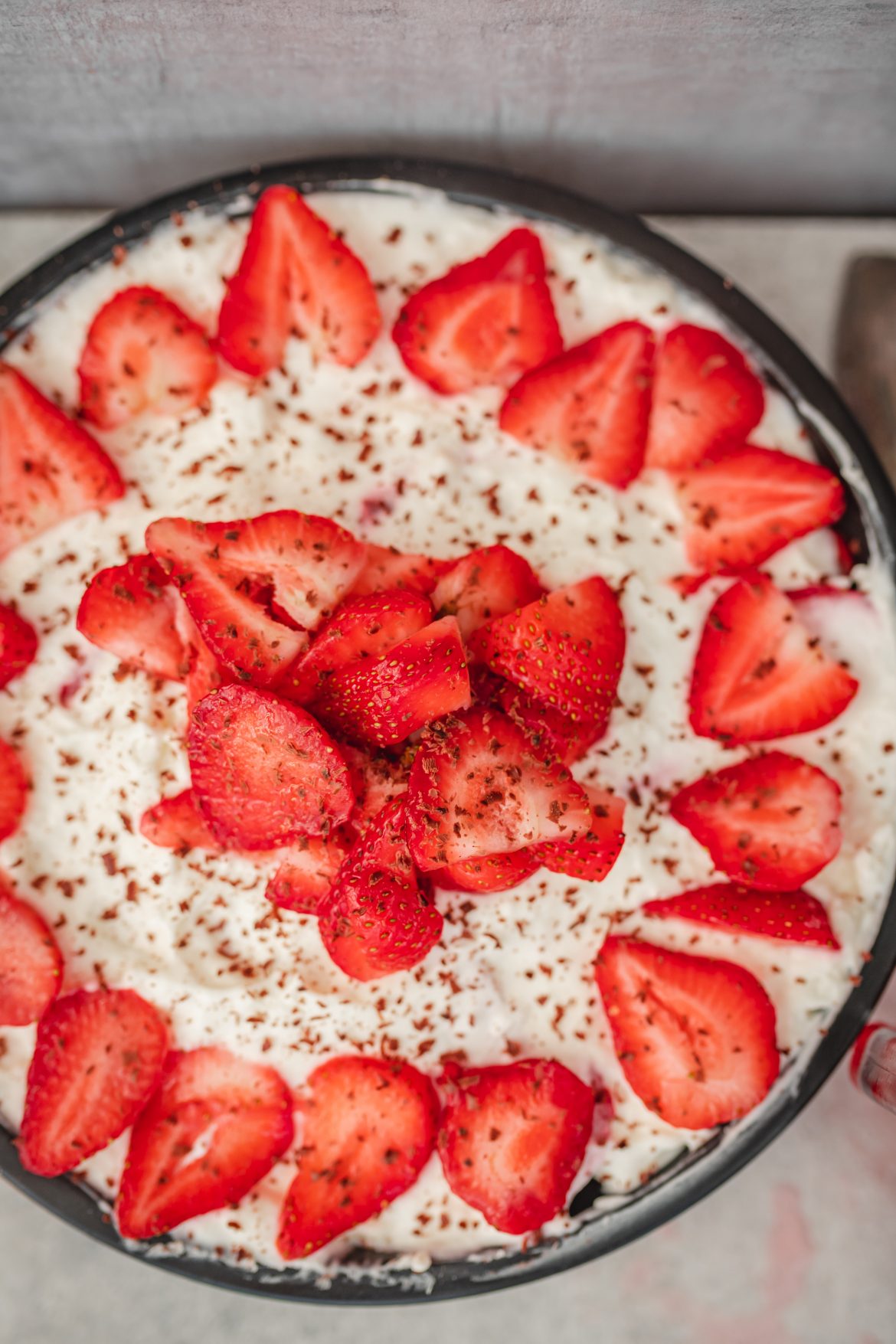Add another layer of cheesecake filling and another layer of strawberries on top.