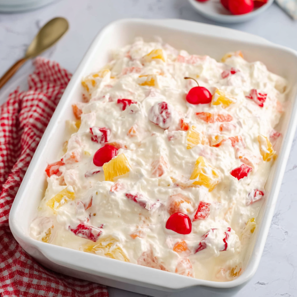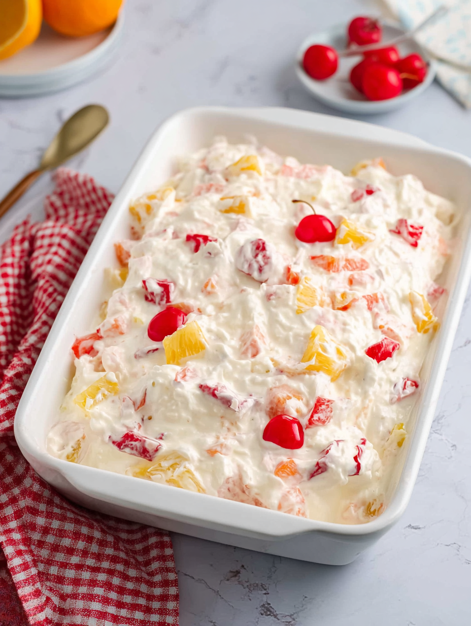 Stir in the fruit, cherries, and marshmallows. Everything should be well coated in that creamy mixture.