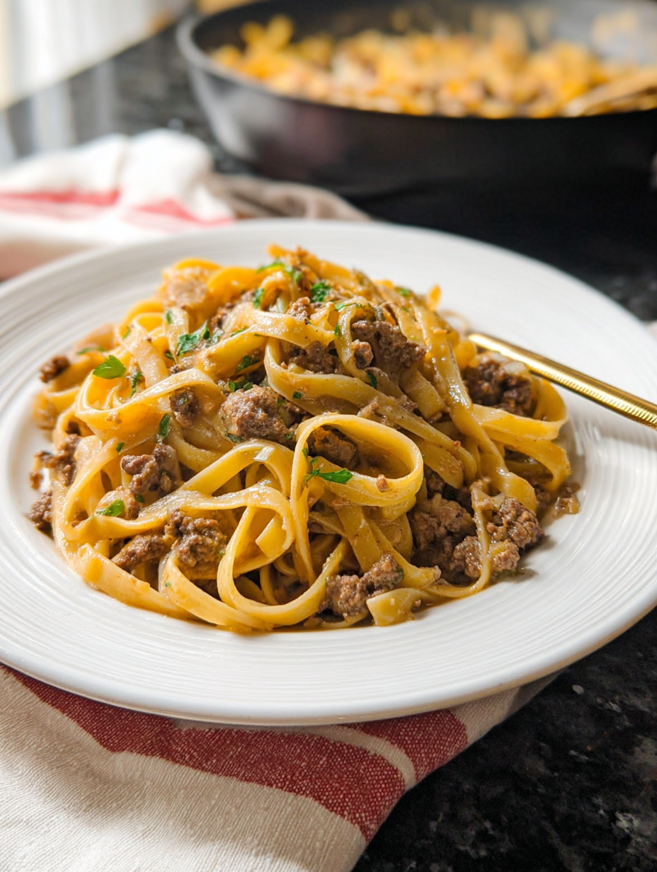 There is something so comforting about a creamy pasta dinner that comes together in one pan, especially after a long, busy day. The rich garlic butter sauce, tender ground beef, and silky noodles create the kind of meal that feels like a warm hug in a bowl.