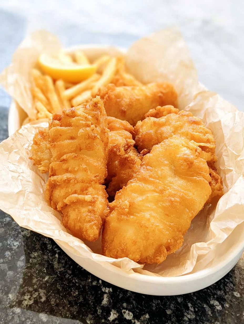 Carefully lower the battered fish into the hot oil, frying in batches to avoid overcrowding. Fry for 2–3 minutes, or until the fish floats and the batter is deep golden brown. The fish should be fully cooked and flaky inside.