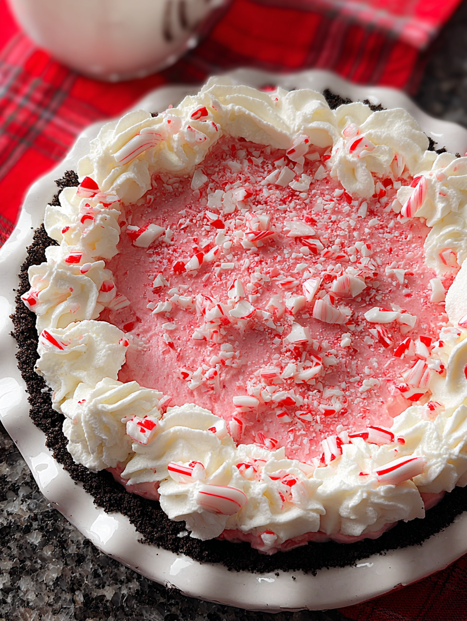 Just before serving, top the pie with Cool Whip and a generous sprinkle of crushed peppermint candies. This adds both flavor and a picture-perfect holiday touch.