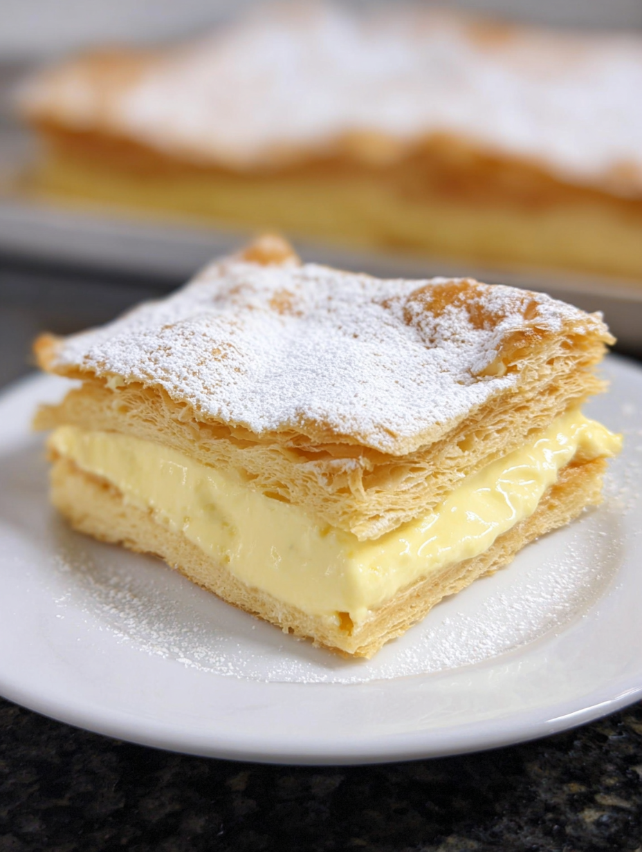 There is something undeniably elegant about a dessert that looks bakery-worthy but is secretly made right in your own kitchen. These Vanilla Custard Cream Squares are one of those timeless treats — light, airy choux pastry layered with a rich, silky vanilla custard and finished with a snowy dusting of powdered sugar.
